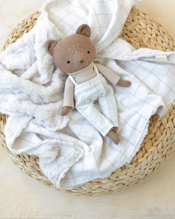 Panda Soft Toy in red gingham and a cozy sage turtleneck