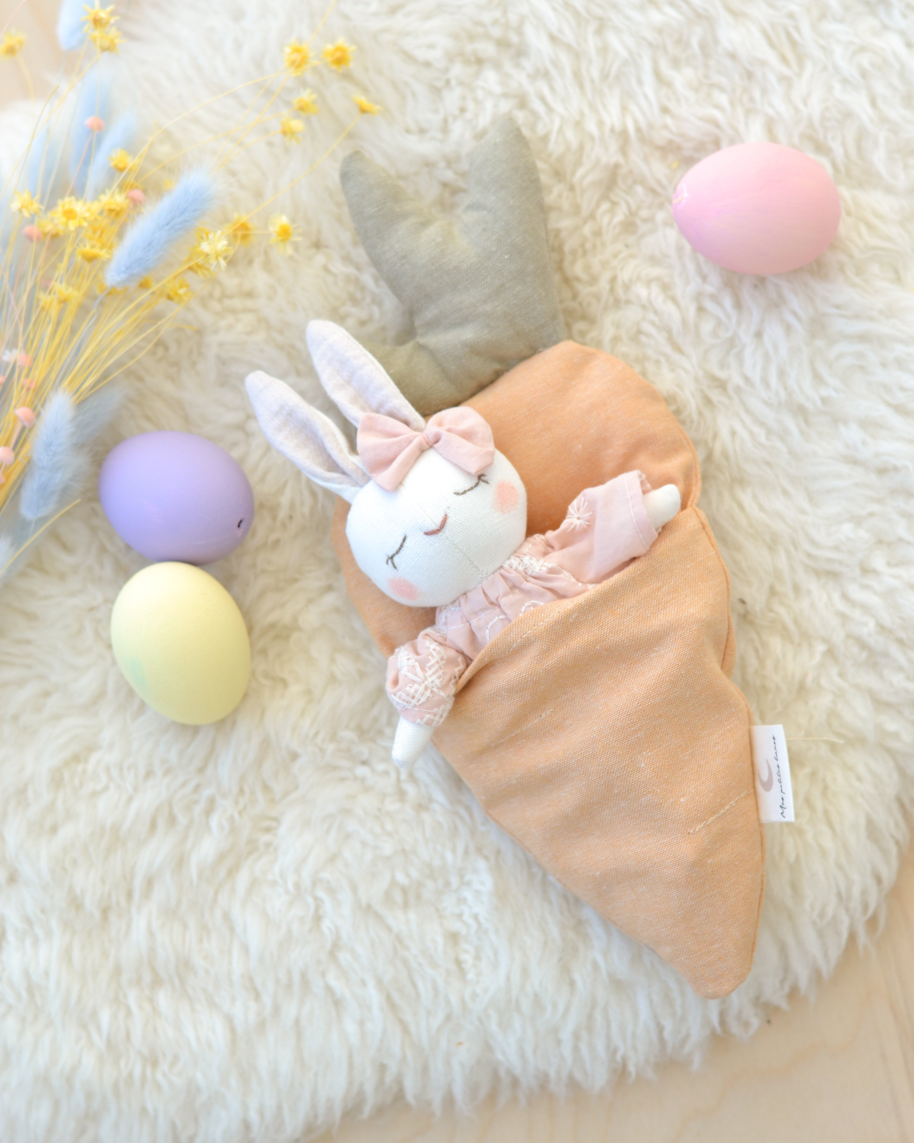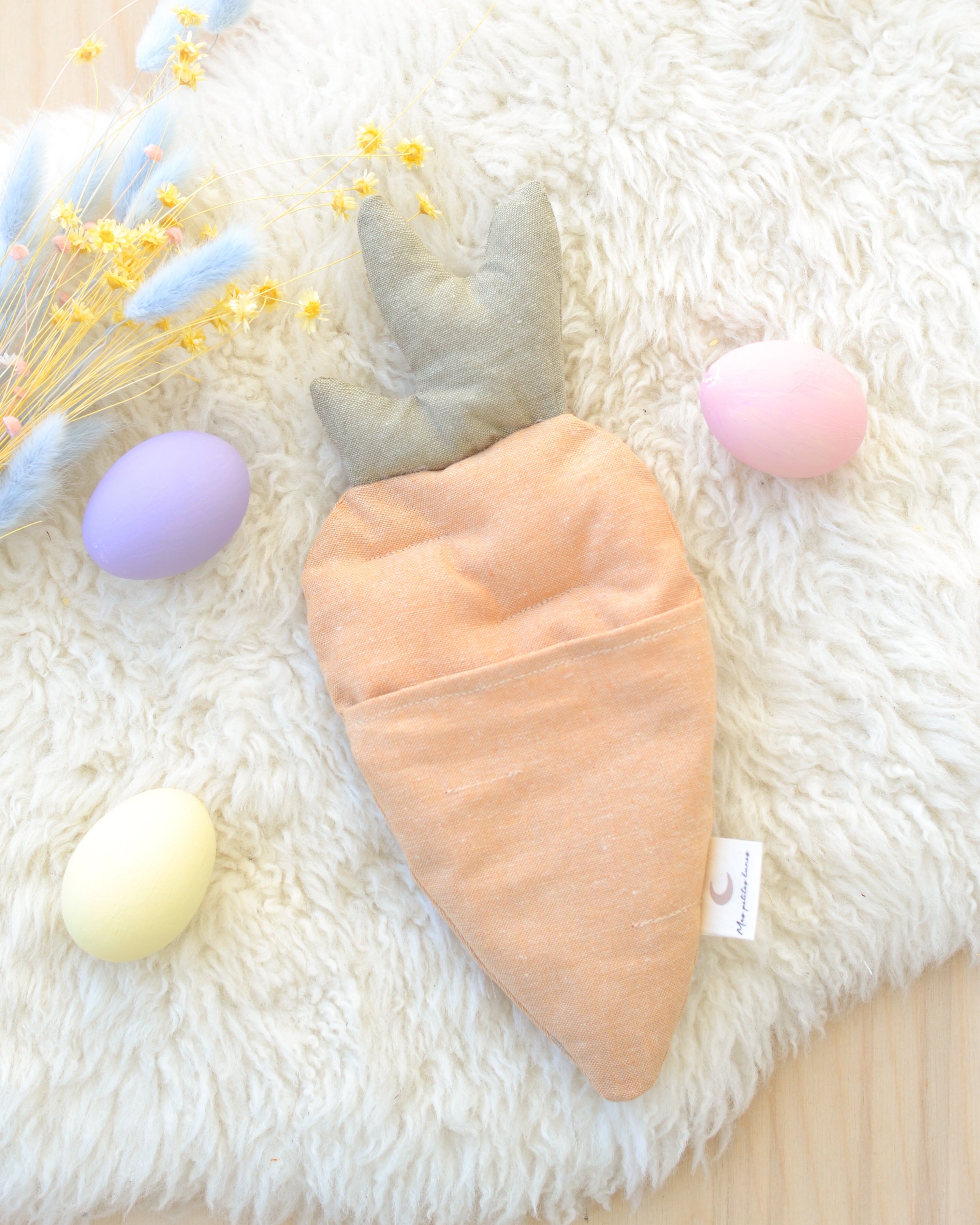 La cama de zanahoria también está hecha de una mezcla de telas duraderas de lino y algodón, rellena con fibra de poliéster hipoalergénica.