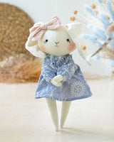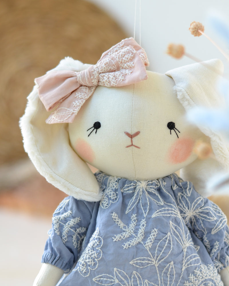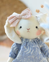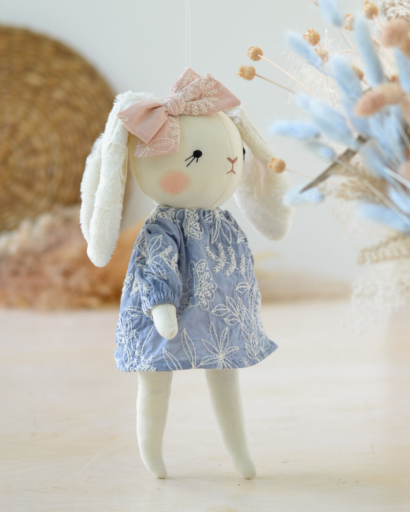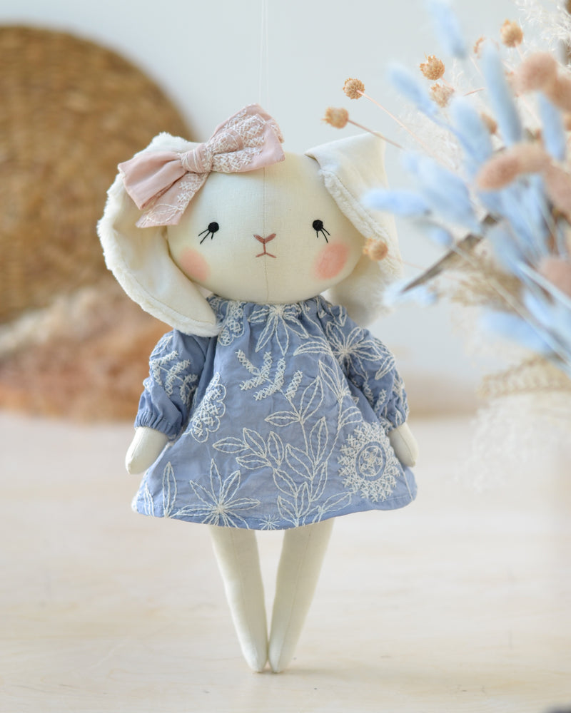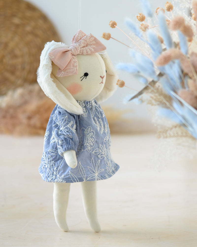 Cette jolie poupée est unique et est fabriquée à la main à partir d'un patron original que j'ai créé. Elle mesure environ 35 cm (14 pouces) des pieds jusqu'au sommet de la tête. Son corps est fait d'un tissu de qualité composé de lin et de coton et est fermement rembourré avec de la fibre de polyester hypoallergénique. L'intérieur de ses oreilles sont en polyester super doux (minkie). Son visage est brodé à la main et ses joues sont peintes au pinceau.