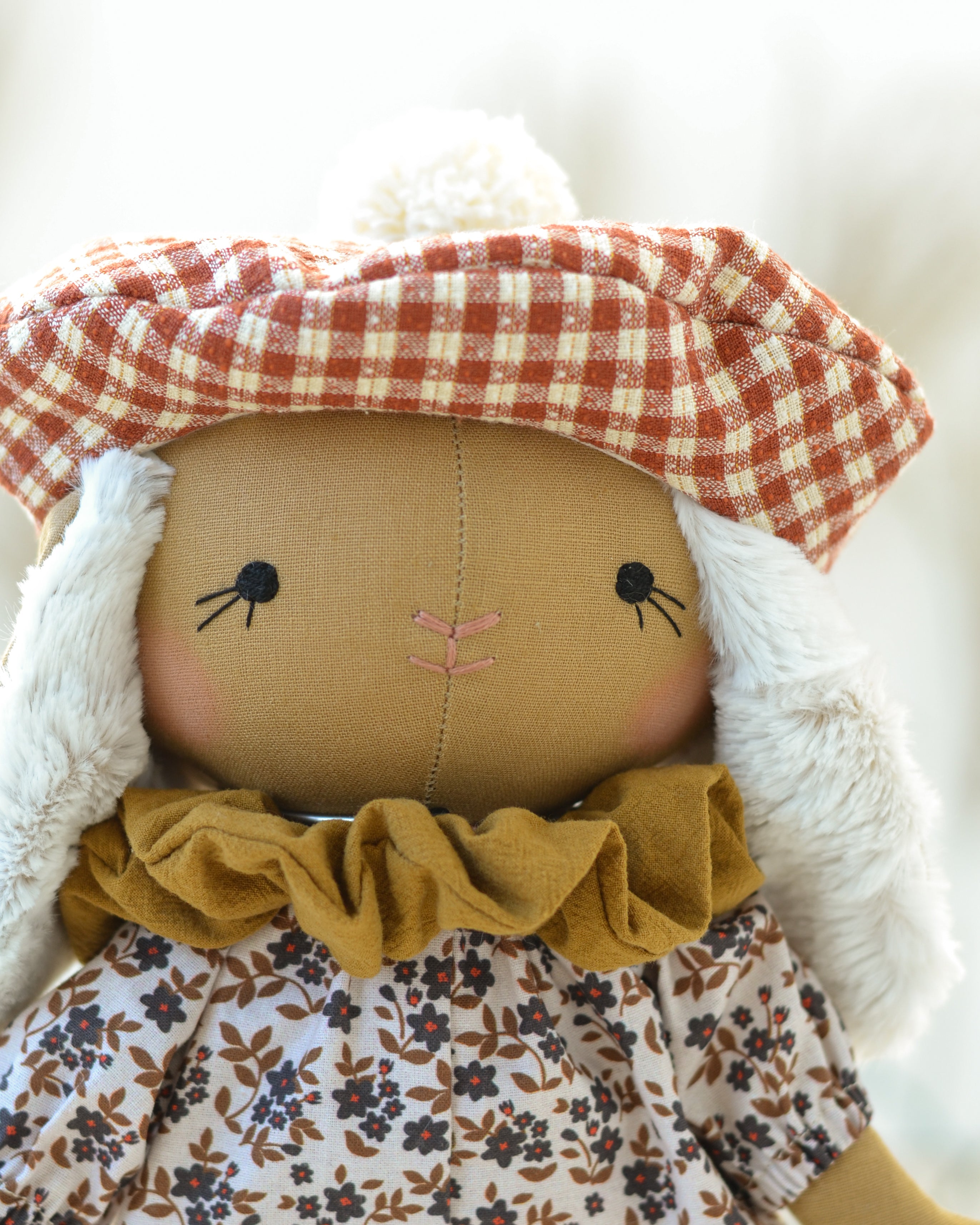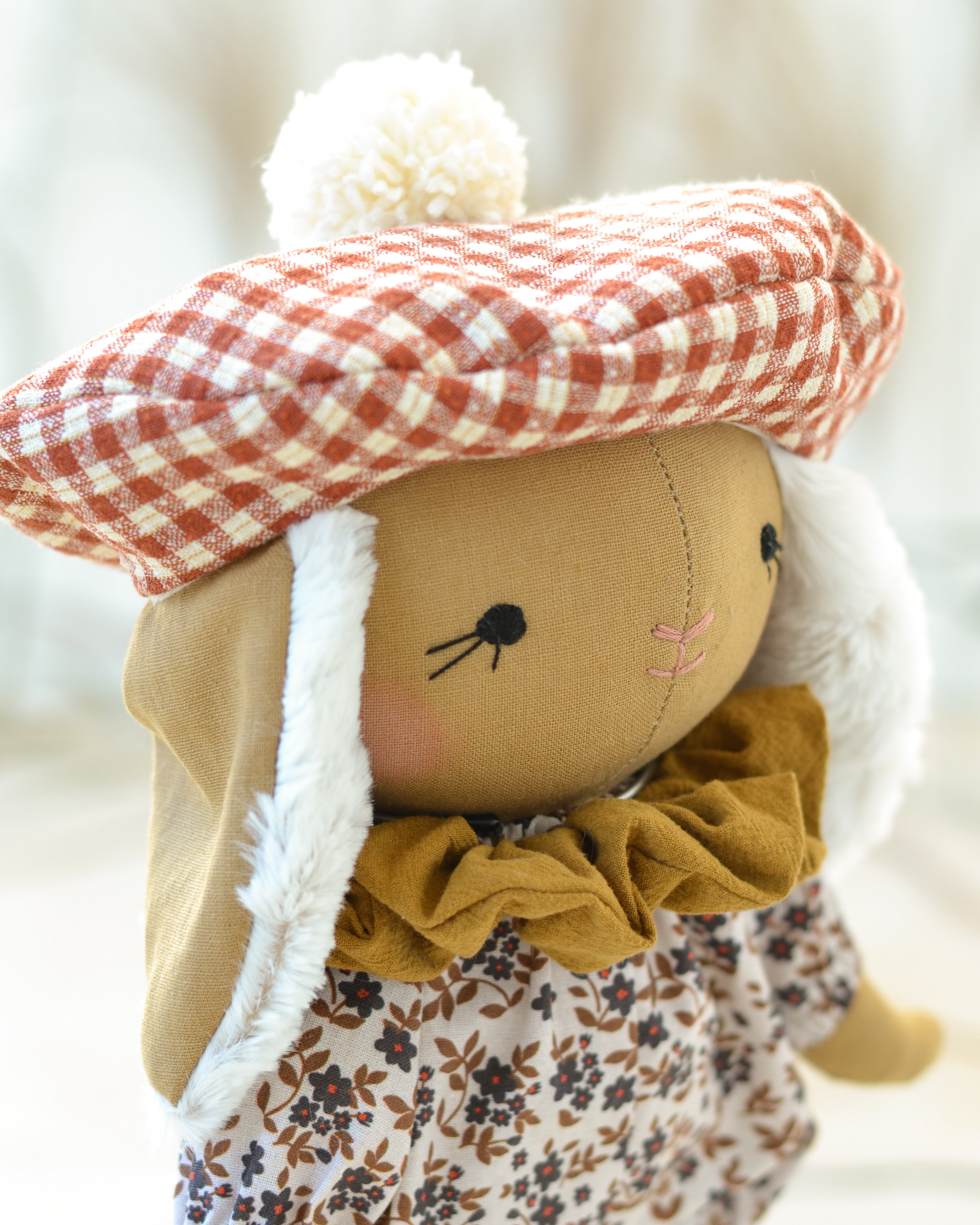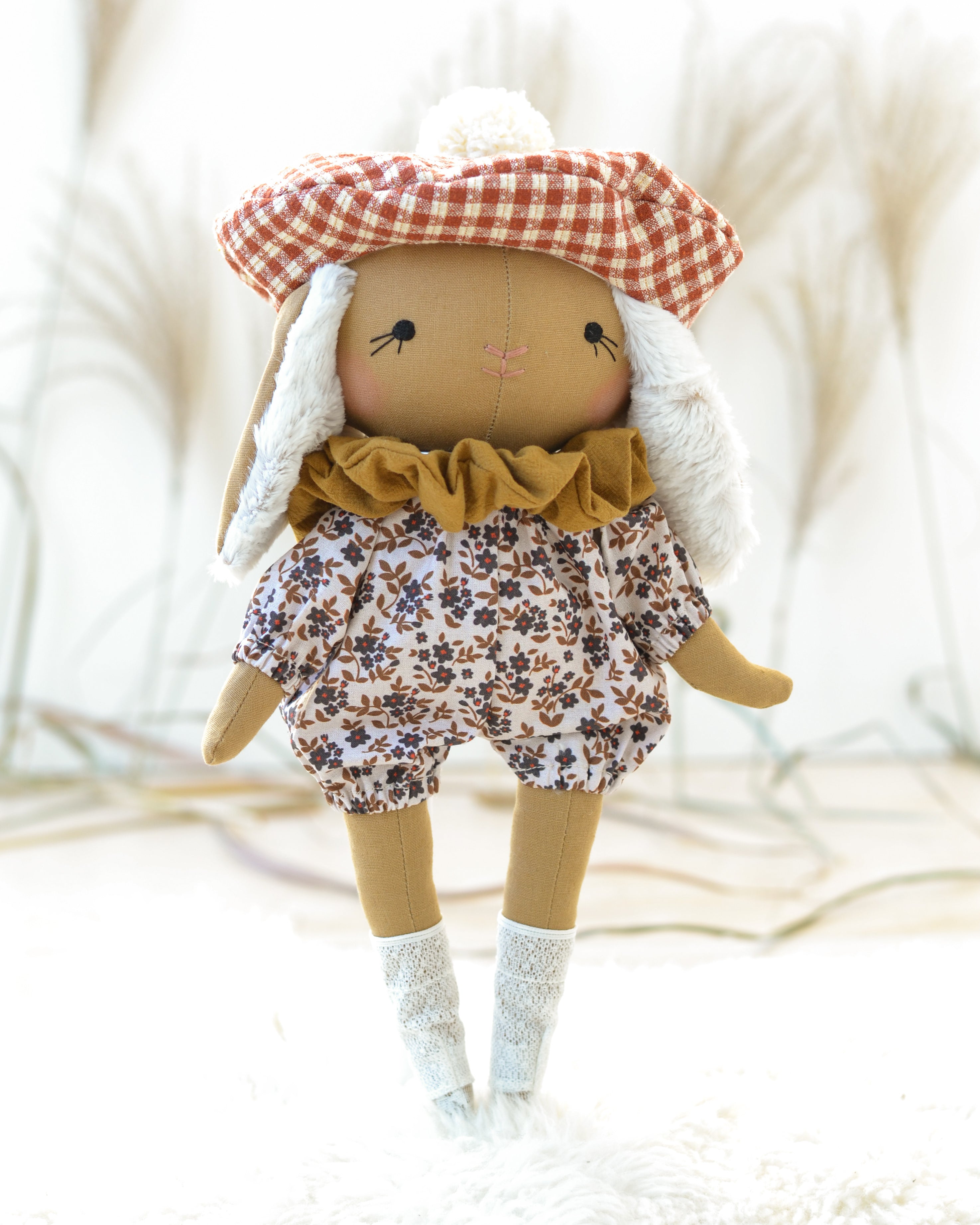 Cette jolie poupée est unique et est fabriquée à la main à partir d'un patron original que j'ai créé. Elle mesure environ 35 cm (14 pouces) des pieds jusqu'au sommet de la tête. Son corps est fait d'un tissu de qualité composé de lin et de coton et est fermement rembourré avec de la fibre de polyester hypoallergénique. L'intérieur de ses oreilles sont en polyester super doux (minkie). Son visage est brodé à la main et ses joues sont peintes au pinceau.