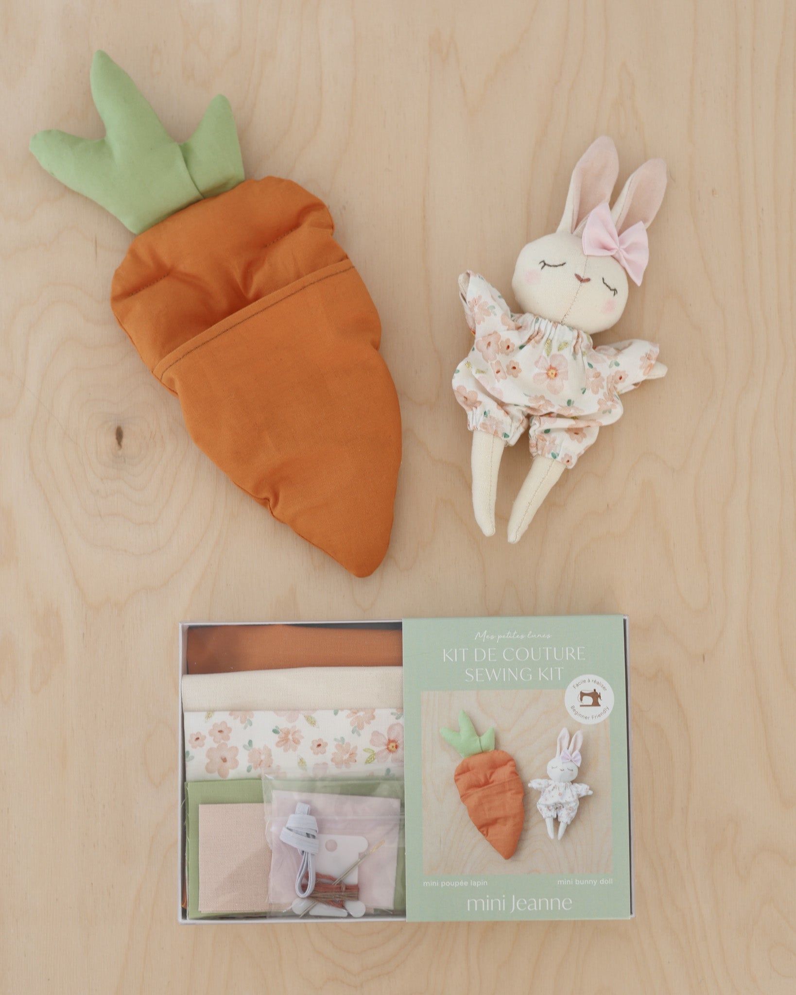 この簡単でステップバイステップのソーイングキットで、あなただけのMes Petites Lunesのミニバニードールを作りましょう!中には、かわいいミニロンパースとミニリボンを身にまとい、にんじん型のベッドで穏やかに眠る、6インチ(15 cm)のぬいぐるみを作るために必要なすべてが入っています。針から生地、印刷されたパターンまで、細部にわたりこのボックスに含まれており、あなたのクラフト体験をスムーズで楽しいものにします。