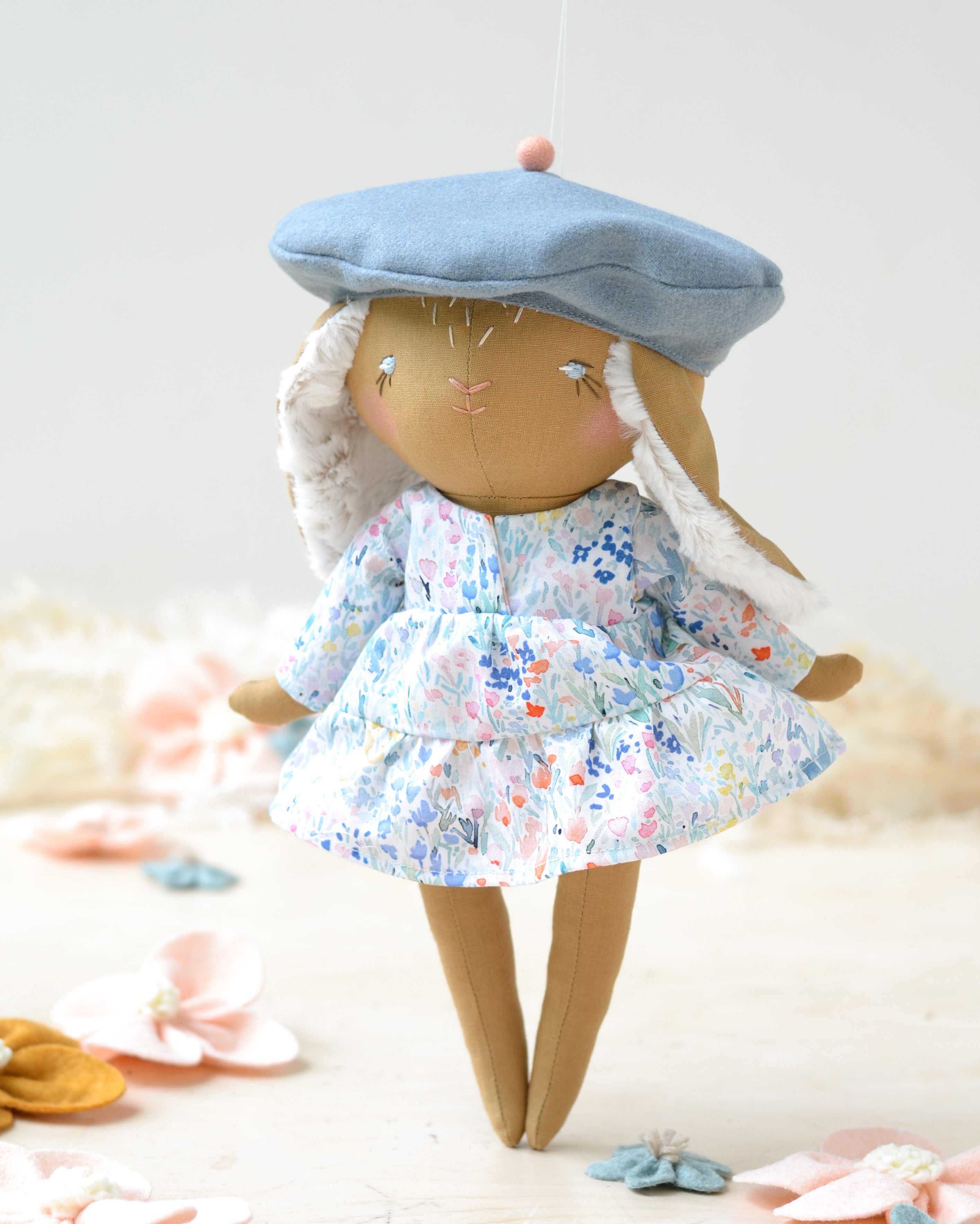 このかわいい人形は、私が作成したオリジナルのパターンから手作りされた唯一無二の作品です。彼女の身長は足から頭のてっぺんまで約35cm(14インチ)です。体は高品質の綿とリネンの混紡生地で作られており、低アレルギー性のポリエステル繊維でしっかりと詰められています。耳の内側は超柔らかいポリエステル(ミンキー)でできています。顔は手刺繍で、頬は手描きです。