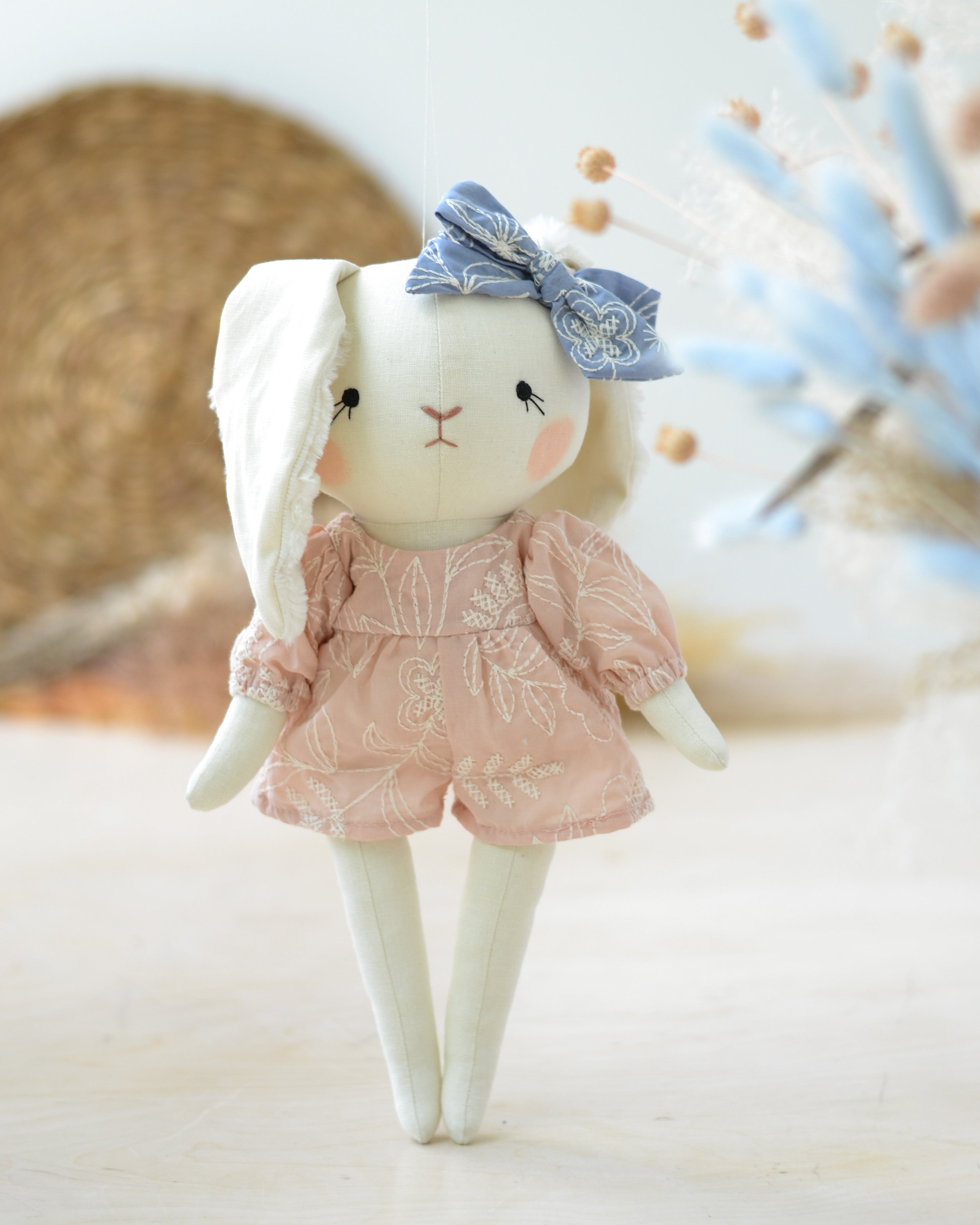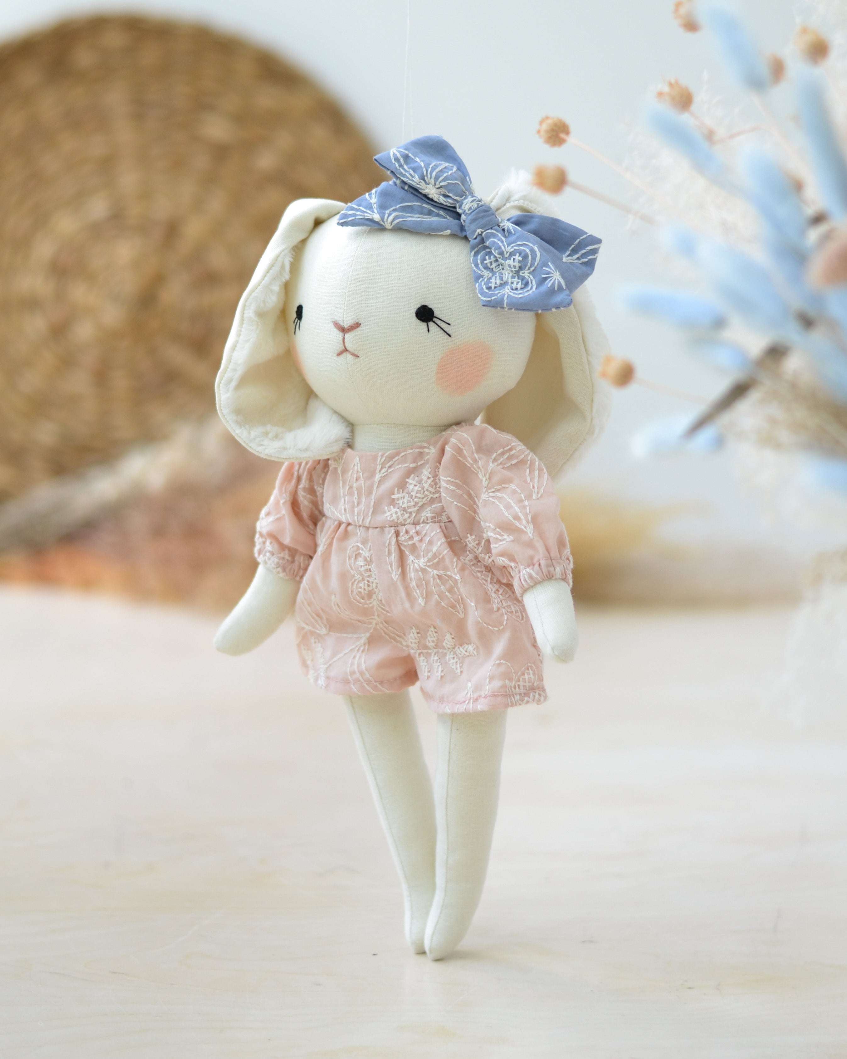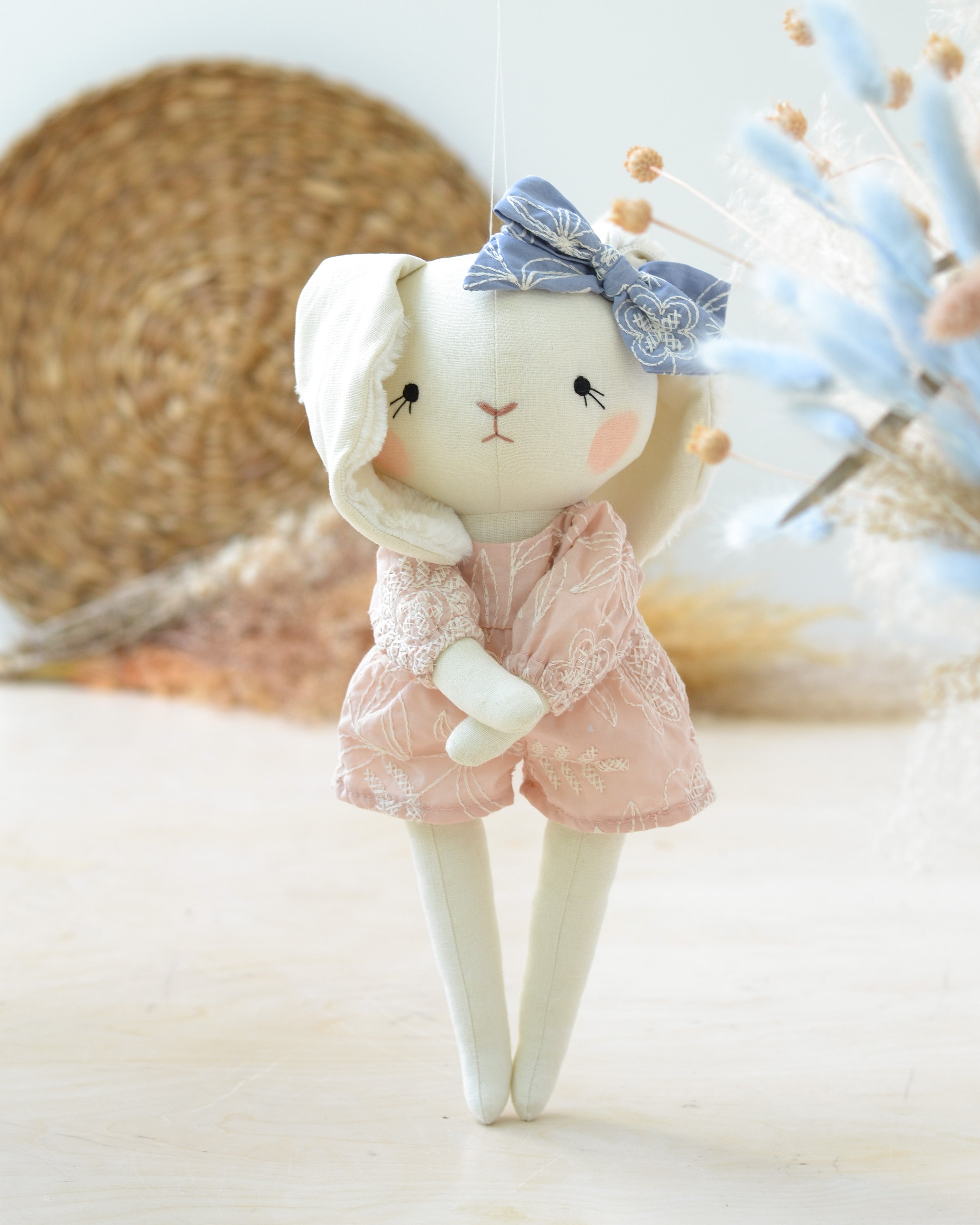 This pretty doll is unique and handmade from an original pattern I created. She measures approximately 35 cm (14 inches) from feet to top of head. Her body is made of a high quality cotton and linen blend fabric and is stuffed firmly with hypoallergenic polyester fiber. The inside of her ears is made of a super soft polyester (minky). Her face is hand-embroidered and her cheeks are hand painted.
