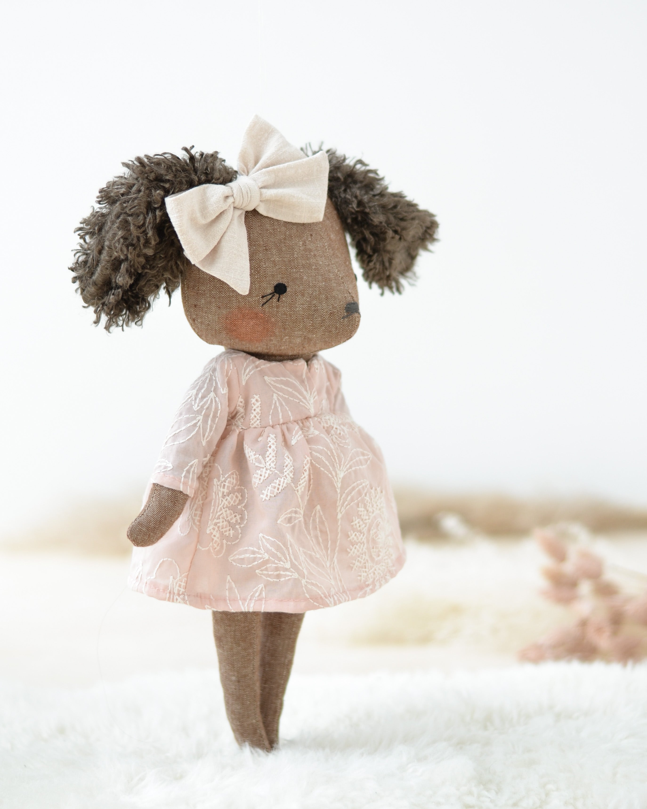 This pretty doll is unique and handmade from an original pattern I created. It measures approximately 35 cm (14 inches) from the feet to the top of the head. Its body is made of a durable fabric composed of linen and cotton and is firmly padded with hypoallergenic polyester fiber. The back of his ears is super soft polyester. Her face is embroidered by hand and her cheeks are painted with a brush.