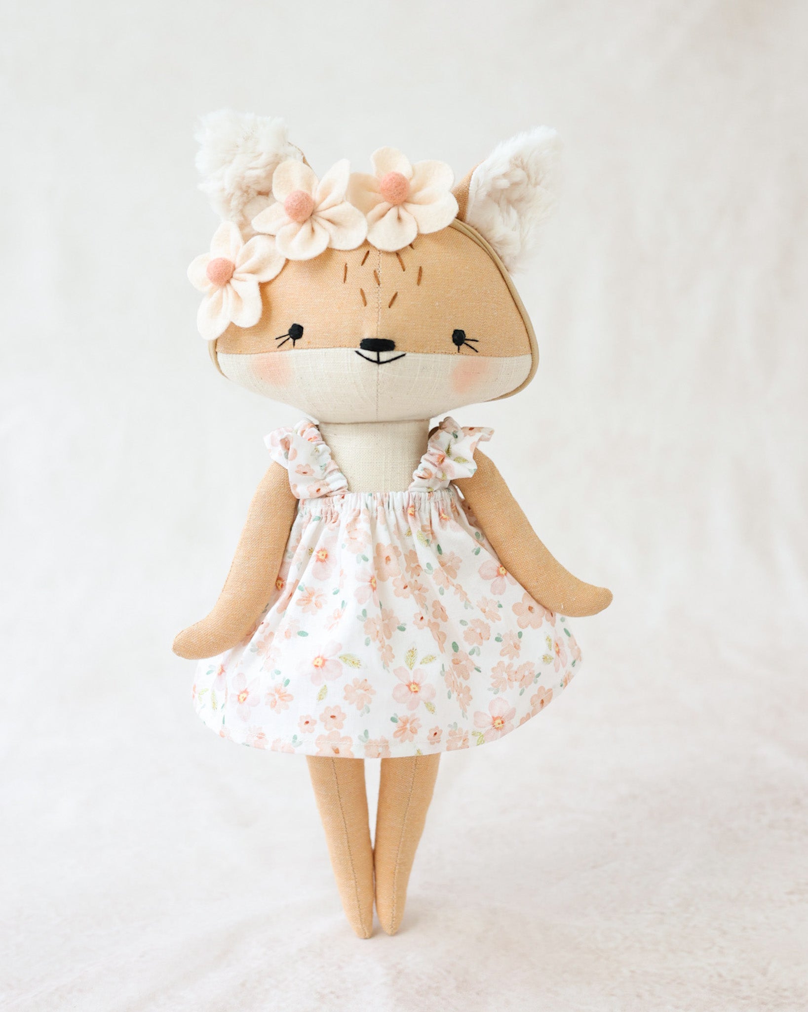 This pretty doll is unique and handmade from an original pattern I created. She measures approximately 35 cm (14 inches) from feet to top of head. Her body is made of a high quality cotton and linen blend fabric and is stuffed firmly with hypoallergenic polyester fiber. The inside of her ears is made of a super soft polyester (minky). Her face is hand-embroidered and her cheeks are hand-painted.